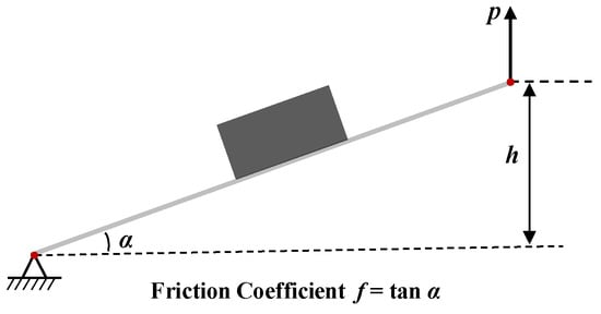 The friction coefficient of the compacted clay–steel interface was determined using the method [41,42] shown in Figure 13. First, the prepared NDB specimen was placed in the middle of the steel plate. Then, the steel plate was slowly raised until the specimen began to slide. The lifting height, h, of the steel plate was tested. The friction coefficient f can be calculated according to the relationship between f and α (f = tanα), where α is the angle between the steel plate and the horizontal direction. According to the above method, the average f was 0.4 for the compacted clay NDB specimen and the steel plate under the steel support (the steel plate is of the same material as the steel support), i.e., the friction coefficient between the support and the specimen was regarded as 0.4 in this paper.