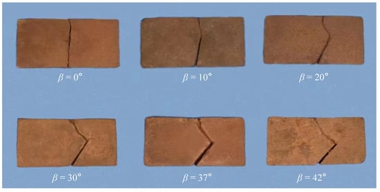 To verify the effect of support friction on the test results, consistent with previous studies, support friction was not considered in designing the crack inclination angle of the specimens. According to the YI–β curve corresponding to f = 0 in Figure 4, six crack inclination angles were selected, namely β = 0° (pure mode I), 10°, 20°, 30°, 37°, and 42° (pure mode II). Two sets of parallel specimens, totaling 12 specimens, were considered.