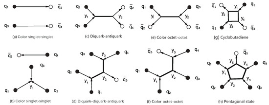 Based on the color flux-tube structures of baryons and mesons, as well as the similarity between the color flux tubes and chemical bonds, those of a multiquark system with particles can be generated by replacing a quark or an antiquark in an N particle state by a Y-shaped junction and two antiquarks or two quarks. Therefore, the multiquark states should possess abundant color flux-tube structures. In the following, we concentrate on the color flux-tube structure of the tetraquark and pentaquark states, which are presented in Figure 2. A thin line only stands for a - or -dimension color flux-tube starting from a quark or ending at an antiquark. A thick line represents a -, -, -, -, or -dimension compound color flux-tube coming from the coupling of the other two color flux tubes.