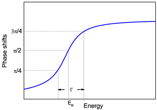 When a resonance state couples to the continuum states of its two-body decay channels, the scattering phase shifts of the two particles in the decay channel will change rapidly as the collision energy tunes through the resonance [114]. The rapid phase change is a general feature of resonance phenomena; see Figure 3. The center of mass energy with phase shift gives the mass of the resonance ( in Figure 3), and the difference of the energies with phase shift and gives the partial decay width of the resonance ( in Figure 3).