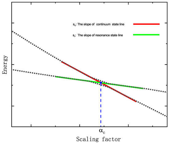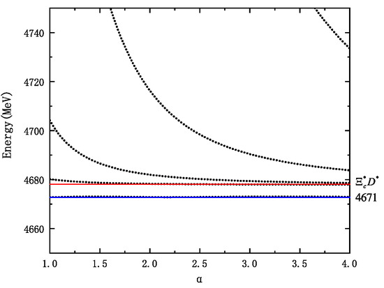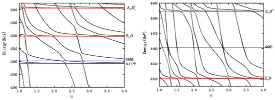 The real scaling method (also called stabilization method) [117] has been developed to identify the genuine resonances from the states with discrete energies in the calculation with finite volume. In this method, a factor is used to scale the finite volume. The energies of scattering states will fall off towards their thresholds, and the resonance will show up as an avoided crossing structure with the increase in (see Figure 4). The reason is as follows. If the energy of a scattering state is far away from that of the resonance, the coupling between the resonance and the scattering states is weak, and the energy of the resonance is almost stable. When the energy of the scattering state approaches that of the resonance due to the increase in , the coupling will become strong. If is increased further, the separation between the energies of resonance and scattering states will increase and the coupling will become weak again. In this way, an avoided crossing structure appears. This is a general feature of two interacting energy levels. Because of the continuum nature of the scattering states, the avoided crossing structure will show up repeatedly with increasing . In addition, from the slopes of resonance and scattering states, the decay width can be estimated by the following formula: