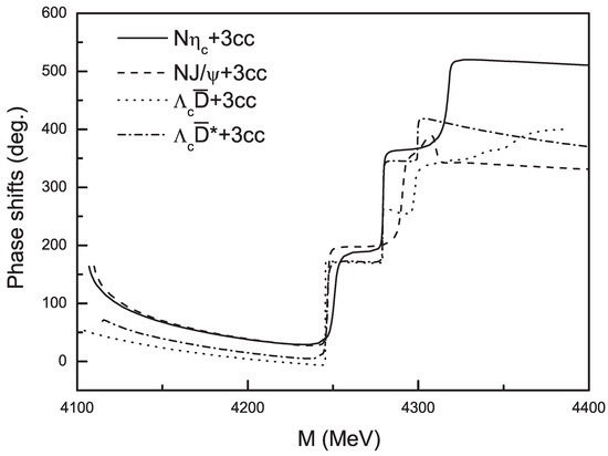 To perform the scattering phase shift calculation at the quark level in hadron physics, the resonating group method (RGM) [115,116], which was developed to deal with the bound and scattering problems of two composite particles, is generally employed. In RGM, the internal degrees of freedom of two composite particles are frozen, and only the relative motion between two composite particles needs to be investigated. Taking the pentaquark system as an example and assuming that there are two channels—the first is the scattering channel, for example, (), and the second is a resonance channel, ()—the wave functions of the system can be written as