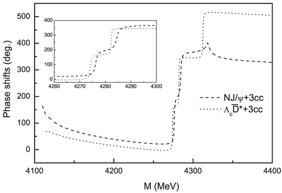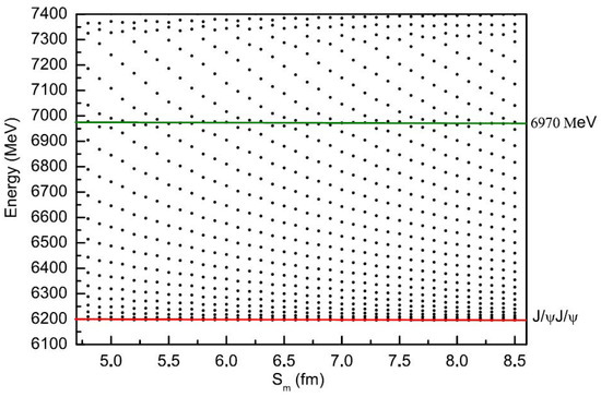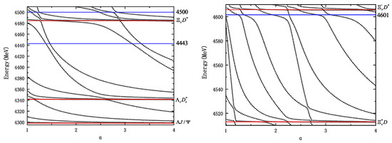 By expanding the orbital wave functions of in Equation (14) with Gaussians, the above eigenvalue equation turns into a generalized eigenvalue problem of a matrix. Usually, the dimension of the matrix is very large, so an approximate method, an accumulating approach [90], is widely adopted. In this approach, one always performs a two-channel coupling calculation, and one of with given channel i, to obtain the mass shift . The total mass shift is the summation of each . This approach is a good approximation when the coupling among different four (five)-quark channels can be neglected. Otherwise, the diagonalization of a high-dimensional matrix is necessary.