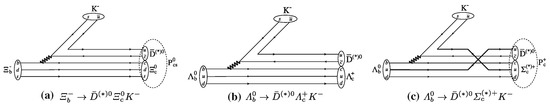 The pentaquark state with a similar configuration is usually called diquark–diquark–antiquark configuration; see Figure 2d. It has three color coupling modes, , , and . The was pioneered by Jaffe and Wilczek to explain the structure of the pentaquark state [26]. However, the mass of this mode is not the lowest in the state mainly because the P-wave excitation between two “good” diquarks and occurs due to the requirements of the Bose–Einstein statistics [27].