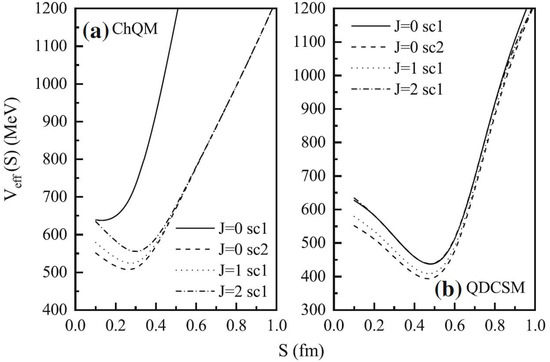 The color screening confinement potential can automatically match the quadratic one in the short-distance region (). When two baryons are separated by large distances, the confinement potential can guarantee that the energy of the hexaquark system evolves into the sum of the two-baryon internal energy calculated by the model Hamiltonian. In the intermediate range region, hybrid confinement can give a different picture from that given by a single form confinement. The model can describe the nuclear intermediate range attraction and reproduce the scattering data and the properties of the deuteron. However, the detailed relation between quark delocalization and meson exchange is not yet clear. In addition, the model can avoid the spurious van der Waals color force between two color singlets arising from the direct extension of the single-hadron Hamiltonian to the multiquark states [75,76]. The model has been widely applied to investigate the properties of the baryon–baryon, baryon–meson, and meson–meson interactions [77,78,79,80,81].