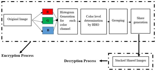 Encryption techniques are classified as symmetric, asymmetric, and visual cryptography []. The symmetric technique requires a single key (private key) for encryption and decryption. Asymmetric encryption relies on two keys: a public key is used for encryption and a private key is used for decryption. Visual cryptography (VC) has many applications in privacy protection, online transaction security, and voting security. VC is used to solve the secret-sharing problem. When the secret image is decomposed into shares, each of these shares cannot reveal any clues about the secret image. Conversely, stacking these shares up allows the decrypted image (secret image) to be revealed. However, applying a hybrid scheme, in which VC and symmetric techniques are hybridized, may strengthen security in most cases [,,,,]. Our scheme has the following advantages over existing schemes: it includes color-shared images, no computation is required for decoding, and there is no interference from the shared image with the recovered secret image.