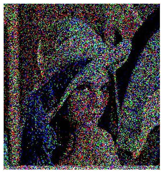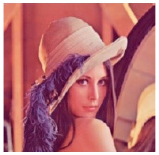 At the initial stage of the process, the original image color is represented by RGB pixel values I. Then additional matrices are derived from I to indicate RGB pixel values as Rp, Gp, and Bp elements separately. These elements have the same dimensions as I. H is the height of the secret image, and W is the width of the secret image, respectively. The image’s original pixel values are represented as shown in Figure 2, Lena’s image. Equation (14) represents the extracted pixels of the colored secret images which consist of red, green, and blue pixels.