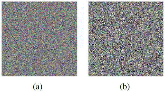 A share-generation process is used separately for each color channel. During the first phase, a combination of Boolean matrices, ShareR1, ShareG1, ShareB1 and ShareR2, ShareG2, and ShareB2, for each color channel is produced. Having the same proportions between each share and the hidden image, each share’s pixel is calculated based on the probability of color levels determined by a probability solution in HHO []. As shown in Figure 5, the encrypted images look like disordered images.