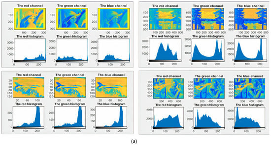 From the histograms in Figure 6, the secret image and its corresponding shared images are examined. The shared images no longer resemble the original secret image. This ensures that the secret image is not disclosed to an enemy if they are able to access separate shares of the image. Additionally, histograms demonstrate how well-protected the proposed scheme’s encryption is, producing shares that are entirely distinct from the original image. Since Share1 and Share2’s histograms are comparable, only one of them is displayed in the diagram. Figure 7a shows the histograms for each original image with their color channel histograms. Figure 7b shows the histogram for each color image with a histogram for its shared image. Hackers cannot infer information about secret images from shared images since the two histograms are not matched.