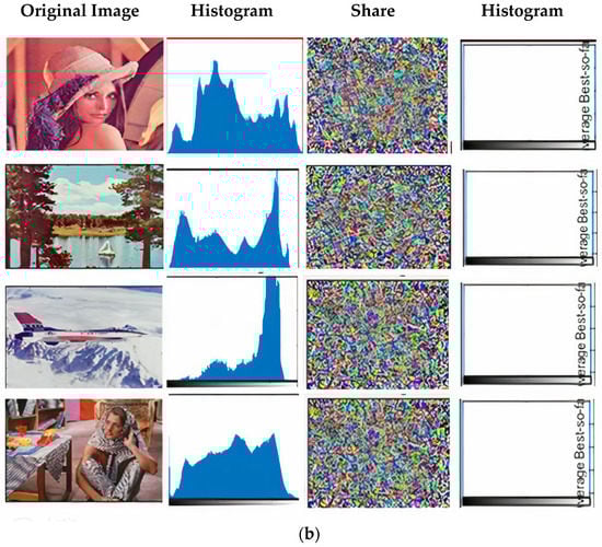 This figure compares the histogram of the four tested images: (a) Four test images and their corresponding share images analyzed by histograms; (b) Histogram analysis of test images and their shares.