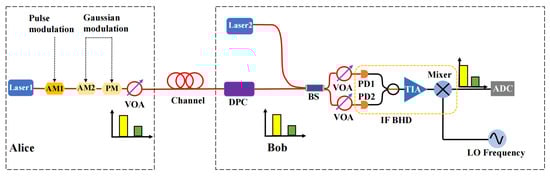 Here, the setup of the local local oscillator CV-QKD system with the intermediate-frequency BHD inspired by [,] will be introduced. We adopt the GMCS and heterodyne detection scheme where there exists a frequency difference between signal laser and local LO laser. The structure of the LLO CV-QKD scheme is shown in Figure 1. At Alice’s side, the continuous-wave laser (Laser1) at 1550.12 nm produces coherent light. Then, the light source is modulated by an amplitude modulator (AM1) at a repetition rate of to generate pulse trains of width , including signal pulses and time-multiplexed pilot pulses of higher optical power. To implement the overall Gaussian modulation, another phase modulator (PM) and amplitude modulator (AM2) utilize the electrical modulation signals generated by the digital-to-analog converter (DAC) to modulate the signal pulses, respectively, according to a uniform distribution and a Rayleigh distribution. Note that at this stage, the pilot pulses are further modulated to carry the information used for frequency offset and phase compensation. Then, a variable optical attenuator (VOA) is utilized to attenuate the signal pulses into a weak quantum signal with an optimal modulation variance and attenuate pilot pulses.