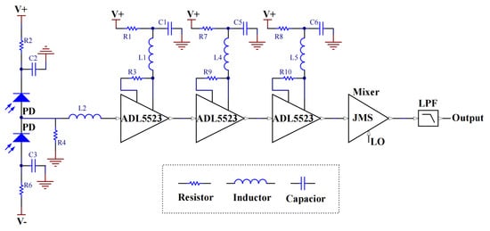 The simplified electronic circuit schematic of the intermediate-frequency BHD is shown in Figure 2, which is mainly composed of three parts. The first part is the photoelectric conversion section, which includes two reverse-biased InGaAs photodiodes (Hamamatsu, G9801-32, bandwidth: 2 GHz, junction capacitance: 1 pF, sensitivity ratio: 90% and quantum-efficiency: 72.2% at 1550 nm). The PDs generate the current signal, which is amplified by the circuit amplification part. The second part is the circuit amplification section, which consists of a resistor and a triple-stage ratio frequency (RF) amplification chip. First, the current signal is amplified by the ground resistance to achieve current-to-voltage conversion. Then a triple-stage RF amplification chip (ADI, ADL5523) is used to amplify the voltage signal. Traditional design prefers to use the trans-impedance amplification chip, and the trans-impedance amplifier (TIA) performs well in the low frequency, typically around tens of MHz. However, for intermediate-frequency BHD, the trans-impedance amplification chip cannot meet the requirements. Because of the limitation of the gain-bandwidth product (GBP), the gain of the amplifier decreases as the operating frequency increases. For the trans-impedance amplification chip, the value of the GBP is fixed, so the balance of the gain and operating bandwidth needs to be considered. The bandwidth of general TIA starts from DC to a variable frequency, and typically stops at tens of MHz. Moreover, the designed working frequency of the intermediate-frequency BHD is not in the base band, so the TIA chip is not the right choice.