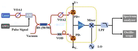 Figure 3 shows the diagram structure of the optical experiment. First, the laser generates a 1550 nm continuous-wave light, and a VOA1 is utilized to attenuate the signal power. The pulsed signal generated by an arbitrary waveform generator (AWG) is modulated into the continuous-wave light by an amplitude modulator. Then, the signal light interferes with the vacuum through the 50:50 BS after which the outputs are followed by a variable optical delay (VOD) and a VOA2 for keeping a perfect balance of two arms. The amplified intermediate-frequency signal is moved to the base band by a mixer, and a low pass filter (LPF) is utilized to filter out the useless signal. Finally, we use the spectrum analyzer (Rigal DSA815) and the oscilloscope (Keysight Technology MSOS804A) to analyze the output signal.