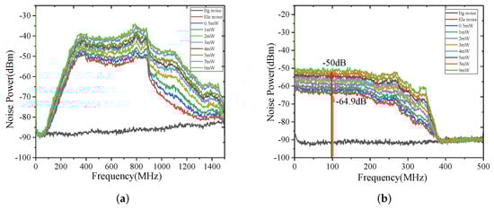 To prove the designed intermediate-frequency BHD can be applied in the local local oscillator CV-QKD, we have taken several relevant measurements on the frequency domain and time domain to obtain the information about QCNR, noise, and bandwidth. The test structure diagram can be obtained by removing the AM in Figure 3. The frequency mixer is indispensable for intermediate-frequency BHD, so the test results should include the measurement without the frequency mixer and the measurement with the frequency mixer. Figure 4a shows the bandwidth and noise power of the intermediate-frequency BHD without the frequency mixer. In this part, the bandwidth of the band pass area is from 300 MHz to 800 MHz. The output noise power of the amplification circuit starts to rise slowly from around kHz, reaching a high point at 300 MHz, and beginning to drop sharply from 800 MHz. Nevertheless, the downtrend from 900 MHz to 1200 MHz is not intuitive, and the main reason is that the frequency response design of the intermediate-frequency amplification circuit is not perfect. Although the intermediate-frequency amplification circuit has some defects, the whole performance of the circuit is excellent compared with other BHDs. Figure 4b shows the bandwidth and noise power of the intermediate-frequency BHD with the frequency mixer. The LO input of the mixer is a 500 MHz sine signal, which is necessary to obtain the down-conversion signal. Because the effect of low-frequency 1/f noise is eliminated, the quantum noise curve starts from DC rather than kHz. Simultaneously, the electronic noise of the intermediate-frequency BHD reaches a low level, which is quite crucial for the local local oscillator CV-QKD. For intermediate-frequency BHD, the bandwidth is about 270 MHz, and the amplification gain is quite flat. The quantum noise power rises with the increase of the input optical power and starts to fall from 270 MHz. We also obtain the QCNR information of the intermediate-frequency BHD in Figure 4b. As the optical power increases, the output noise ranges from DC to 270 MHz rises, then rolls down owing to the limitation of the bandwidth. The QCNR of the intermediate-frequency can attach 14.9 dB when the optical power is 9 mW. When the optical power reaches a certain threshold, the noise spectrum starts to increase. If the optical power is much higher than the threshold, the noise spectrum becomes the background noise spectrum of the spectrum analyzer. The main reason is that the amplification circuit has already saturated when the optical power exceeds the threshold.