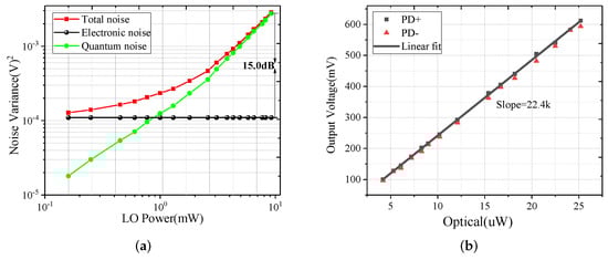 The electronic and quantum noise in BHD are subject to Gaussian distribution. Meanwhile, the intermediate-frequency BHD is AC-coupled, so the mean of the noise is zero. In practice, the quantum noise variance cannot be measured in complete isolation from source of classical noise, so for intermediate-frequency BHD, the measured total noise variance of intermediate-frequency BHD by the oscilloscope is the sum of the quantum noise variance and the electronic noise variance. The electronic noise consists of the background noise of the instrument and electronic noise of intermediate-frequency BHD, which is mainly composed of the electronic noise of BHD. We obtain the electronic noise of intermediate-frequency BHD by the oscilloscope when the optical path is blocked, and the total noise is measured in different input optical powers. It is not difficult to obtain the corresponding quantum noise by subtracting the electronic noise from the total noise. We use the Keysight oscilloscope to measure the total noise and the electronic noise in the time domain. In order obtain enough data to analyze, we set the oscilloscope sampling rate to 10 GSa/s and set the time base to 1 s. First, we need to measure the electronic noise voltage when the optical power is zero under these test conditions. Then we can obtain the total noise voltage by changing the optical power. During the data processing, one data point is selected every 10 data points in the raw data to avoid correlation. It is vital to obtain the electronic noise and the total noise variance from the selected data. As shown in Figure 5a, it is clear that the quantum noise variance increases with the increase of the local oscillator power in an area, and we obtain the rough linear region of the intermediate-frequency BHD. The measured value of QCNR in the time domain is about 15 dB at a LO power of 9 mW. The limitations of measuring instruments cause the different values of the QCNR in the frequency domain and time domain. However, the QCNR in the time domain still has a perfect agreement with that in the frequency domain. After analyzing the above test results, it is evident that the idea of designing an intermediate-frequency BHD with high speed is achievable.