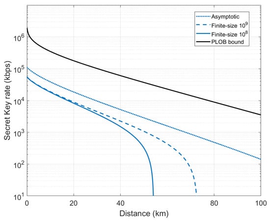 Secure key rate as a function of the transmission distance-based intermediate-frequency BHD. The blue curves from left to right represent the achievable key rate considering the finite-size effect with , , and the asymptotic effect. Besides, the black curve corresponds to the PLOB bound [,]. Other parameters in our results are as follows: the modulation variance , the electronic noise , the detection efficiency , the loss coefficient of optical fiber = 0.2 dB/km, and the excess noise .