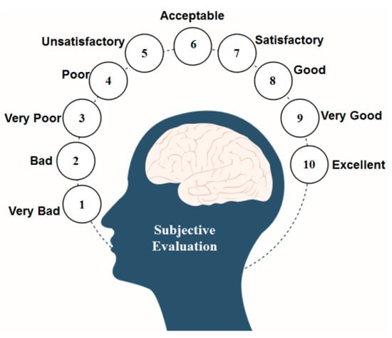 The subjective evaluation experiment is a crucial aspect of this study since it reflects consumers’ direct subjective feelings. Various subjective evaluation methods exist, such as the ranking method, pairwise comparison method, semantic subdivision method, and hierarchical evaluation method, each with its advantages and disadvantages. Given the specificity of this test, the pairwise comparison method was used to subjectively evaluate the tractors. The method involved scoring the subjective feeling of the human body on a scale of 1 to 10, ranging from the degree of discomfort to comfort, as shown in Figure 5. The scale has ten basic levels between “Very Bad” and “Excellent”, each with a different score. The arithmetic mean of all the evaluators’ scores is the comfort level of the sample, with lower ratings indicating lower comfort levels [].