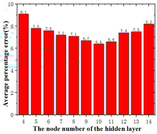 The average percentage error of the BPNN at different node numbers of the hidden layer.