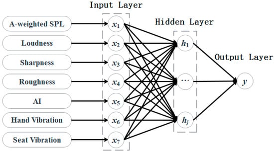 From the 30 collected samples, 6 were chosen as test samples, and the remaining 24 samples were designated as training samples. Before the training process, data normalization was performed to address the issue of different parameter dimensions. For input layer nodes, the objective parameters, namely, A-weighted sound pressure level (A-SPL), loudness, sharpness, roughness, AI, hand vibration, and seat vibration, were selected as the input variables. On the other hand, the output layer nodes corresponded to the subjective evaluation values of tractor cab comfort.