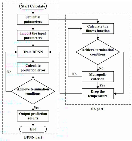The simulated annealing (SA) algorithm was used in this study to optimize the BP neural network and overcome its limitations, such as slow training speed and the risk of getting trapped in a local optimum. The SA algorithm is a probabilistic algorithm that is inspired by the annealing process in metallurgy. It is used to find the global optimum of a given function. It has fewer constraints on initial conditions and is widely used for searching for optimal solutions compared with other algorithms.