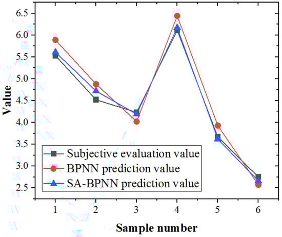 Figure 9 and Figure 10 show that the SA-BPNN model had a generally higher prediction accuracy than the BPNN model. The maximum absolute percentage error of the predicted value of the BPNN model was 8%, while the minimum value was 5%. In contrast, the maximum absolute percentage error of the SA-BPNN model was 4.4%, and the minimum absolute percentage error was 1.1%, both of which were below 5% and indicate that the SA-BPNN model could accurately predict subjective driver comfort. When comparing the maximum prediction error of the genetic algorithm–BP neural network (GA-BPNN) model, as reported in [] with a value of 10.74%, to that of the genetic algorithm–support vector regression (GA-SVR) model with a maximum prediction error of 6.75%, the SA-BPNN model employed in this study demonstrated a higher prediction accuracy. Consequently, the SA-BPNN model was capable of more accurately predicting driver subjective comfort.