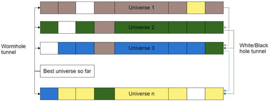 The MVO algorithm, as one of many multiple metaheuristics, has behaviors based on cosmology, using wormholes, white holes, and black holes as its main components in searching for solutions to the problems being applied, as illustrated in Figure 1. Other researchers [,,] have used MVO in some specific cases applied to manufacturing processes or in benchmark tests, as in our previous works; however, other authors have implemented some methods to improve the algorithm, such as neural networks and Levy flights, which aid in the search for optimal solutions for the MVO algorithm.