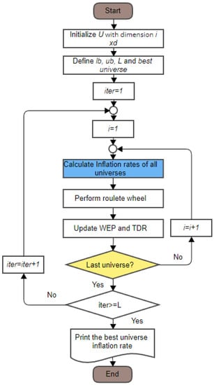 The last equations reside over WEP and TDR represented in (4) and (5), where and are the minimum and maximum values for WEP, goes for the actual iteration, and is the maximum number of iterations; in the case of TDR, they are the same parameters, including as the precision of exploitation. In Figure 2, we illustrate a complete flowchart of the MVO algorithm.