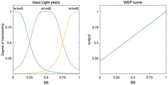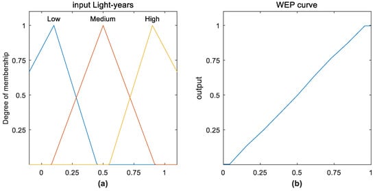 Sugeno model for WEP. (a) Input light-years of fuzzy inference system; (b) output obtained for WEP of fuzzy inference system using weighted average defuzzification method.
