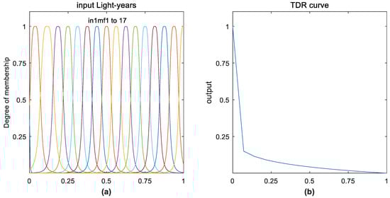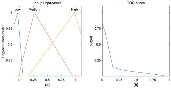 Sugeno model for TDR. (a) Input light-years of fuzzy inference system; (b) output obtained for TDR of fuzzy inference system using weighted average defuzzification method.