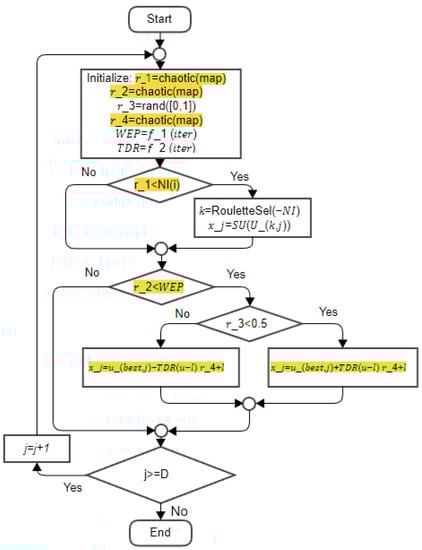 Additionally, in this work, we are using chaos theory to improve the algorithm further alongside Fuzzy Logic by adapting chaotic maps in some of the parameters of MVO, particularly in some random numbers, and here we made several variants of the algorithm. We used 10 of the most used chaotic maps in the literature over several algorithms, and then we made several variants to test which ones work better with the MVO algorithm; in Figure 7, we illustrate a flowchart of the places that we adapted the chaotic maps in the process for selection of universes, and also, we can observe in (2) and (3) the parameters that we replace in , the highlighted text represents the sections of the algorithm that have adaptations of chaotic maps.