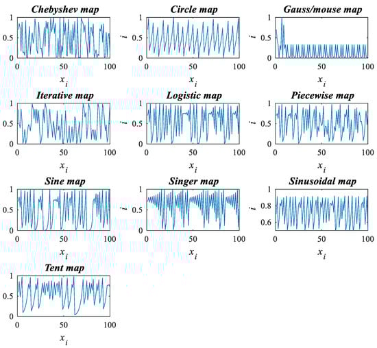 Representation of chaotic maps in Table 1 with 100 iterations.