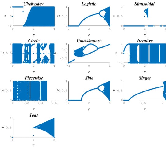 In Table 6, we can find the equations of the 10 chaotic maps used for the variants, and most of them resemble symmetry for the output obtained, illustrated in Figure 8, as well as the bifurcation maps illustrated in Figure 9. Because we made multiple variants, we present first the R1, R2, R4, and RT variants of MVO. In Table 7, we can find a distribution of the parameters where we use chaotic maps.