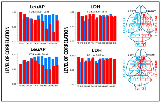 Representation of the levels of correlation indicated in Table 1 and Table 2. The upper figures indicate intra-hemispheric correlations between the left frontal cortex (FC) and the rest of the left regions (L vs. L) (blue bars) and correlations between right frontal cortex and rest of right regions (R vs. R) (red bars) for LeuAP and LDH. The lower figures indicate inter-hemispheric correlations between left frontal cortex (FC) and right (L vs. R) regions (blue bars) and correlations between right frontal cortex and left (R vs. L) regions (red bars) for LeuAP and LDH. Abbreviations: frontal cortex (FC), parietal cortex (PC), occipital cortex (OC), striatum (ST), thalamus (TA), hypothalamus (HT), mesencephalon (MS), medulla (MD), cerebellum (CE), hippocampus (HC), and spinal cord (SC).