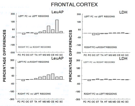 The upper figures indicate the percentage increase between the levels of correlation of the left frontal cortex versus the rest of the left regions (L vs. L) and the right frontal cortex versus the rest of the right regions (R vs. R) for LeuAP (column C of Table 1) and LDH (column C of Table 2): [(higher value/lower value) − 1] × 100. The lower figures indicate percentage increases between the levels of correlation between left frontal cortex versus right regions (L vs. R) and right frontal cortex versus left regions (R vs. L) for LeuAP (column F of Table 1) and LDH (column F of Table 2): [(higher value/lower value) − 1] × 100: positive values indicate predominance of the value of L vs. L over the value of R vs. R and also of the value of L vs. R over the value of R vs. L. Negative values indicate a predominance of the value of R vs. R over the value of L vs. L and also of the value of R vs. L versus the value of L vs. R. Abbreviations: frontal cortex (FC), parietal cortex (PC), occipital cortex (OC), striatum (ST), thalamus (TA), hypothalamus (HT), mesencephalon (MS), medulla (MD), cerebellum (CE), hippocampus (HC), and spinal cord (SC).