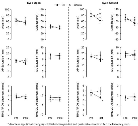 During the eyes-closed condition (Figure 1, right), the analysis of the two-way mixed ANOVA revealed a significant interaction between Time and Intervention for Area, (F[1,30] = 9.063, p = 0.005, η2 = 0.232), Distance (F[1,30] = 7.689, p = 0.009, η2 = 0.204), AP excursion (F[1,30] = 4.213, p = 0.04, η2 = 0.123), and RMS AP displacement (F[1,30] = 4.226, p = 0.04, η2 = 0.123), but not ML excursion (F[1,30] = 0.420, p = 0.52), or RMS ML displacement (F[1,30] = 0.063, p = 0.80). The post-hoc tests revealed that Area, Distance, AP excursion, and RMS AP displacement significantly decreased in the Exercise group only (Figure 1. p < 0.05).