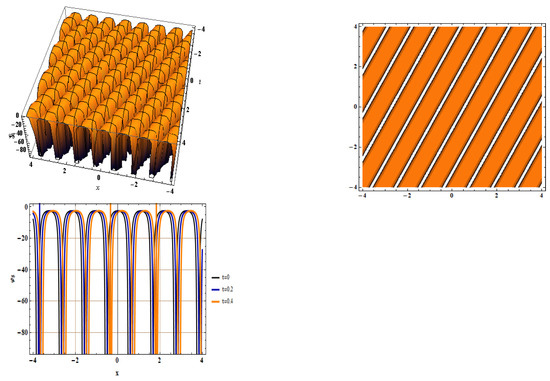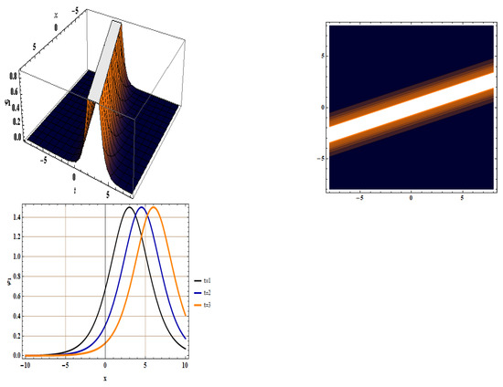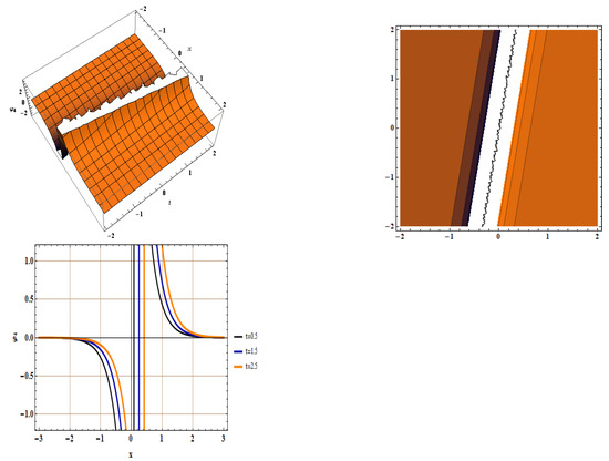 - Bright solitons, singular solitons, and singular periodic solitons have been recorded for , , , and . The obtained results have been displayed in Figure 1, Figure 2, Figure 3 and Figure 4.