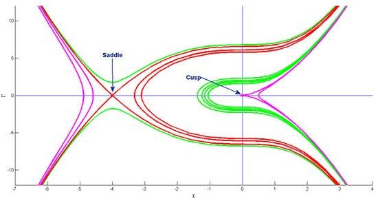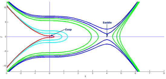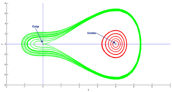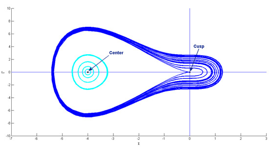 In the present case, we have two points, and , as equilibrium points. Considering such a case is the cusp and is the saddle point. By selecting , , , , , , , and , we obtain and . These points are shown in Figure 6.