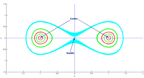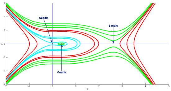 In this case, we obtain , , and as critical points. Taking such a case, and are the central points, while is the saddle point. By putting , , , , , , , and , we obtain , and . These points are displayed in Figure 10.