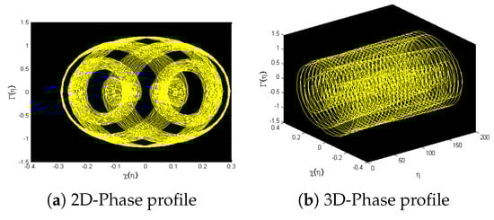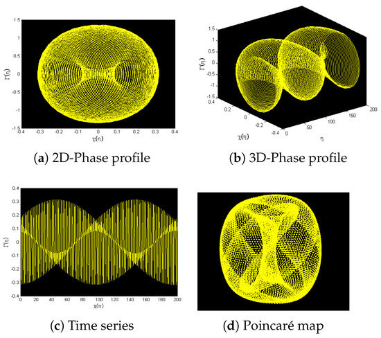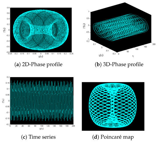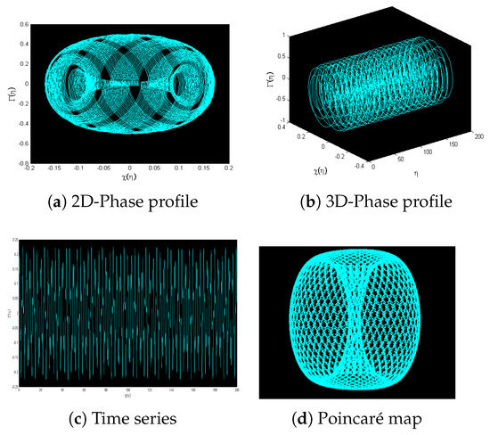 Here, in the above system (44), represents the strength of the disruption and represents the frequency. System (44) has an external periodic force of , which is missing in system (28), to inspect the chaotic and periodic patterns of Equation (2). To tackle this issue, we employ a variety of tools, including the phase portrait approach, time series profiling, and Poincaré maps. To analyze the problem from different perspectives, we will assess the impact of the parameters , , , , and by assuming two alternate scenarios. In the first scenario, we will keep , , , and constant and examine the impact of . In the second case, we will investigate the effect of modifying the other factors while considering and as constants.