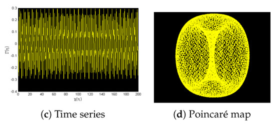 In Figure 11, 3D and 2D phase plots, time analysis graphs, and Poincaré maps are depicted for , , , , and . It is observed that system (44) exhibits quasi-periodic behavior for . Figure 12 presents 3D and 2D plots along with time analysis graphs and Poincaré maps for , while keeping the other factors the same as in Figure 11. System (44) appears to display quasi-periodic characteristics for . In Figure 13, 3D and 2D plots, time series profiles, and Poincaré maps are shown for , , , , and . It is observed that system (44) exhibits quasi-periodic characteristics, while the Poincaré section has several disordered points indicating chaotic motion for the given parameters. In Figure 14, 3D and 2D plots, time series profiles, and Poincaré maps are displayed for , , , , and . It is noted that system (44) demonstrates a quasi-periodic pattern, while the Poincaré map shows many irregular points and depicts chaotic behavior.
