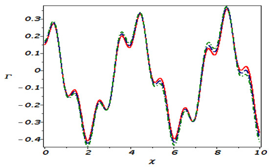 Here, we have the sensitivity of the disturbed system (44). For this objective, we have taken into consideration three distinct initial conditions: , identified by the red solid line, , plotted with the blue dotted curve, and , shown by the green dotted curve. In Figure 15 and Figure 16, three solutions are addressed by considering the same values of parameters as those considered in Figure 11 and Figure 14. In Figure 17 and Figure 18, we make a tiny adjustment in the initial values, and the solutions are attained by choosing the same values for the parameters as in Figure 11 and Figure 14. It is indicated that a slight modification in initial conditions has no major impact on the solution. As a consequence, we conclude that the proposed model is not very sensitive.