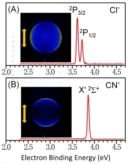 Anion PE-VMI spectra of CN− and Cl− are displayed in Figure 1; it is apparent that double peaks of Cl− ascribed to the transitions of 1S0 → 2P3/2 and 1S0 → 2P1/2 [1]. The first peak of 3.61 ± 0.01 eV was defined as the electron affinity of the Cl atom. For CN−, only a single peak located at 3.86 ± 0.01 eV was visible, at a detachment wavelength of 266 nm, corresponding to the transition of X 1Σ+ → X′ 2Σ+ [38]. This indicated no geometric change between the anion ground state and the neutral ground state of CN. Further visual inspection of PADs in Figure 1 shows that the two images exhibit apparently different PAD characteristics. For Cl−, the electrons detached from the 1S0 state to the spin–orbit states of 2P3/2 and 2P1/2 appeared to possess a strong anisotropy distribution perpendicular to the laser polarization (double arrow in Figure 1). On the contrary, for CN−, the electrons detached from the X 1Σ+ state to the X′ 2Σ+ state were preferentially distributed along the laser polarization.