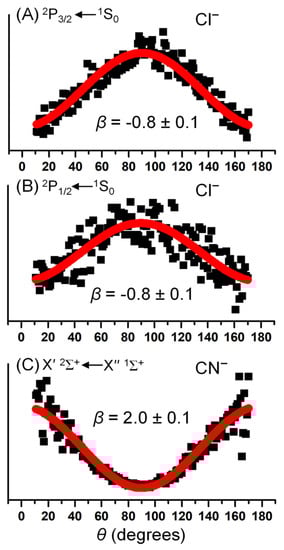 where with l = 1. Equation (10) indicates that as ε → 0, β → 0. Obviously, photodetachment from a p-symmetry orbital yields isotropic distributions near zero photoelectron kinetic energy. However, as photoelectron kinetic energy continues to increase, the asymmetry parameters of β become negative, typically decreasing to a minimum (near −1) below ~2 eV. As the ε increases further, the asymmetry parameters of β increase, becoming positive before ultimately leveling off near β = 1 [43]. Hence, based on the consideration of PAD results for Cl−, a significantly negative parameter, with β = −0.8 at photoelectron kinetic energy of ~1 eV, is typical of detachment from a p-symmetry orbital.