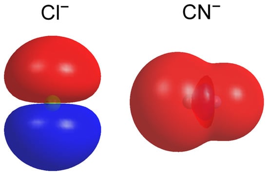 CN− is the simplest pseudohalide, as it is a closed-shell species, and has an electron binding energy of 3.82 eV, comparable with that of Cl−, which has the highest electron affinity (3.6 eV) of all elements in the periodic table [1]. In classic halide-ligated clusters, superhalogen properties have been extensively explored in recent decades due to their exotically higher electron affinities (as high as 14 eV) [12,13]. CN−-ligated compounds have also been extensively explored recently due to their special stability and chemistry resembling that of true halides [14,15,16,17,18,19]. However, CN−-ligated compounds also exhibit distinctly geometric, electronic, and spectral properties compared to other halides. For example, the cyanide anion, CN− is a good hydrogen-bonding acceptor for both the C terminus and N terminus, in which the N terminus of cyanide is a slightly better hydrogen bond acceptor than the C terminus. Interestingly, negative-ion hydrogen-bonded complexes with one H2O as proton donors and pseudohalide CN− and halide Cl− as proton acceptors were compared in theoretical study and an IR vibrational spectra experiment. Both complexes have stable geometries, with the hydrogen-bonded proton being non symmetrically bound [20]. Nevertheless, in contrast to only one stable Cl−···H2O isomer being observed in vibrational spectroscopy experiments [21,22], two stable, singly hydrogen-bonded isomers, NC–···H2O and CN–···H2O, have been confirmed via cryogenic ion vibrational spectroscopy, in which the CN–···H2O isomer was slightly more stable than the NC–···H2O isomer [23]. Close investigations of OH stretching oscillations in previously reported results indicate that the magnitude of frequency redshifts (with respect to free OH stretch, ~3700 cm−1) correlated with the hydrogen bond strength for a singly hydrogen-bonded complex. The OH stretching frequency of Cl−···H2O has been measured as 3285 cm−1 [21], and the OH stretching frequency of CN–···H2O isomer and NC–···H2O isomer have been determined as 3034 cm−1 and 2896 cm−1, respectively [23]. The slightly less red-shifted hydrogen-bonded O-H stretching frequency indicates that halide Cl− is a slightly poorer hydrogen bond acceptor than pseudohalide CN−, in which the C terminus of CN− displays the strongest hydrogen bond strength. This situation is ascribed to the different electronic structure features of CN− in comparison to halide Cl−.