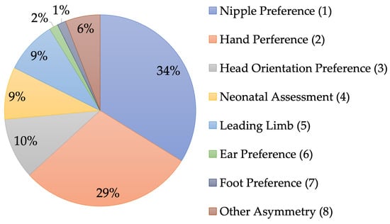 Behaviors examined for laterality in the included studies were classified into one of eight categories (Figure 2). The most-studied asymmetry was nipple preference, followed by hand preference. Within hand preference, unimanual measures were most common and included behaviors like food reaching, nonfood reaching, self-touch, and tool use. Four studies measured bimanual hand preference with the tube task, which is the gold standard in adult primate handedness (for a discussion, see [16]). Nipple preference and hand preference accounted for approximately two-thirds of the laterality categories that were studied. The remaining one-third comprised the other six categories: head orientation preference; neonatal assessment (e.g., adapted Brazelton); leading limb in stepping, crawling, or walking; ear preference; foot preference; or another asymmetry, such as laterality in facial or vocal expressions. Most studies reported data within one laterality category (34 of 47; 72%). This type of design can be used to test continuity or change in a single behavior if multiple timepoints are used with appropriate statistics. There were some studies that reported data for two (7 of 47; 15%) or three (5 of 47; 11%) of the categories, and only one study reported data in four of the categories. Designs with multiple behaviors can be used to test cascades (e.g., early asymmetry predicting a later asymmetry), in addition to change or continuity within individual behaviors, if multiple timepoints are used with appropriate statistics. Only nine studies provided complete raw data for use in future meta-analyses.