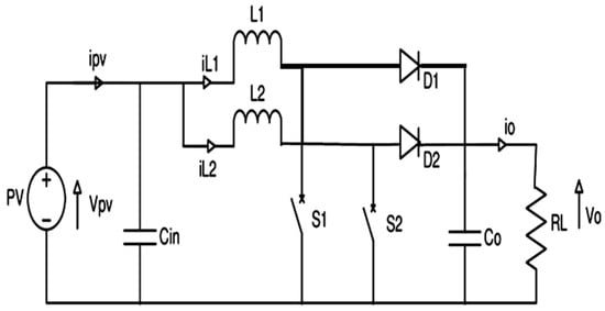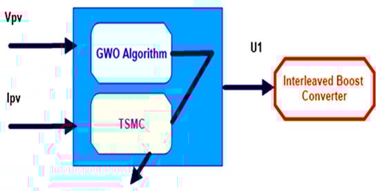 The circuit configuration of the interlocking boost converter, as seen in Figure 3, is intended to maximize power-processing capacity for operating solar systems at maximum capacity. The interlinked topology step-up converters working at 180° degree binary branches from each other. Typically, each procedure works in the same way as a standard boost converter, as described above. The current increases in the inductor L2 whenever two switches are turned on. At this time, the diode D2, which is an energy-saving induction source (S2), has been turned off so that the output voltages are higher than the input voltages.If two switches, S1 and S2, are switched off, the two diodes, D1 and D2, connect and provide the capacitor with energy and load and the two ramps with a path downstream current, depending on the difference between the source voltage and the load voltage. Applying a transition to complete the same case will loop one-half of a switching time later. Due to an efficient improvement in the switching frequency, the interleaved boost converter can offer a low winging strength at the input level, thereby the minimizing output and input condenser Cin the filters, which are comparatively high if a traditional boost transformer is used [11]. Additionally, the transfer and division of the current between the two arms lead to better stability, minimizing major power losses (I2R). Moreover, the changing of the input current between both weapons dramatically reduces power losses by shifting and dividing them (I2R). In addition, the converter puts low stress on the passive and active components because of the existing partitions, which increase the power-processing capacity [12,13,14,15]. On the other hand, with a connected boost converter, the sum of the topology components can lead to higher costs. Optimization-based tuning of the FTSM controller is shown in Figure 4.