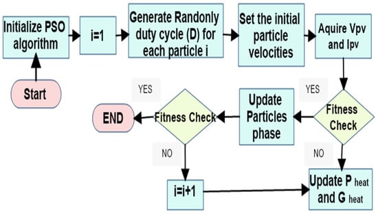 The PSO algorithm shows improvements in its particle velocity, and each interaction corresponds to the best solution both locally and globally. For each event, the acceleration parameter is random and separate. The inertia weight w, for the purposes of this study, was defined as 0.1, and the damping ratio for the inertia was set to 0.99, the personal coefficient of learning (C1) was set to 1.5, the global learning coefficient (C2) was set to 2, and the particle speed was fixed at [−0.085, 0.085] (its maximum and minimum, respectively). The PSO-based MPPT algorithms are explained in [18]. The PSO-based MPPT procedure flow map is shown in Figure 5.