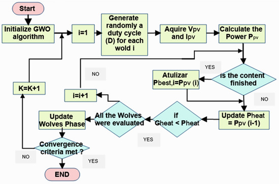 The GWO is an organic algorithm focused on grey wolves’ comportment in the quest for a beast. This algorithm attempts to replicate the behavior of grey wolves with their known hierarchy using four groups of wolves: alpha (α), beta (β), gamma (γ), and omega-fasts [17]. The parameters α, β, γ, and ω represent the leadership of the pyramid in which the α wolves decide on the quest field, the second(β) is a leader, and the third (γ) is a leader that helps the alpha leader make decisions while the rest have to obey the leaders’ decisions. The GWO-based MPPT algorithm is explained in full and in-depth in [17]. Figure 6 shows a flow diagram of the GWO-based MPPT process in which Pbest,I refers to the best I iteration solution and Gbest refers to the best solution found globally by wolves.