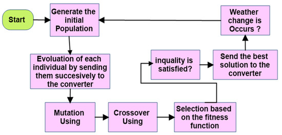 To validate the concepts presented, simulation and experimental testing were conducted. The comparisons were made with the different P&O, GA, PSO, and GWO methodologies. The controller’s aim was to adjust the duty cycle D. The maximum strength of the GWO-FTSM panel optimization technique was adopted for the MPPT for this proposed model. This problem was designed and simulated in MATLAB/Simlink, and the maximum energy harvested by the solar panel was evaluated. The step-by-step procedure of the GA methodology is shown in Figure 8.