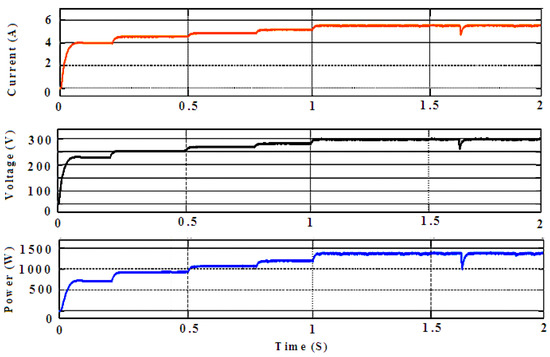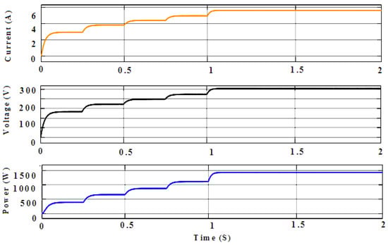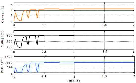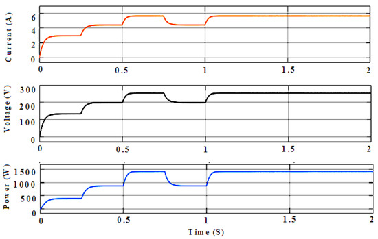The simulation was conducted with the following parameters: E = 1000 W/m2 and T = 25 °C, with subsequent measures applied at t1 = 0 to 0.25 (500 W/m2), t2 = 0.25 to 0.5 (750 W/m2), t3 =0.5 to 0.95 (1000 W/m2), t4 = 1750 W/m2, and t5 = 1000 W/m2, as shown in Figure 9a,b. The simulation was conducted with the starting conditions E = 1000 W/m2 and T = 25 °C. In order to equate this in the proposed GWO-FTSM, which would control the performance, the same simulation was performed for the P&O, GA, PSO, and GWO algorithms. In the case of the P&O-based MPPT’s output power, output voltage, and output current, Vin = 100 V, Iin = 8.6 A, D = 0.5, Vout = 200 V, Iout = 4.3 A, and Pout = 860 W, as shown in Figure 10. In the case of the GA-based MPPT’s output power, output voltage, and output current, Vin = 100 V, Iin = 8.6 A, D = 0.5, Vout = 200 V, Iout = 4.8 A, and Pout = 960 W, as shown in Figure 11. The PV module power PPV, IPV output current, and VPV output voltage effects were compared to the optimal power and optimal tension from the MPPT search algorithm, respectively. In addition, at the first irradiance stage, GWO offered a low output power and less output voltage relative to the GWO-FTSM controller. The control system then used a constant temperature, T = 25 °C, and a varying sinusoidal E radiation. The value of E was given in the following way: the traditional controllers were employed; meanwhile, an oscillating reaction wasted part of the available power generated by the photovoltaic model, thereby reducing the efficiency of the entire generation system (Appendix A). In the case of the PSO-based MPPT’s output power, output voltage, and output current, Vin = 100 V, Iin = 8.6 A, D = 0.5145,Vout = 206 V, Iout = 4.8 A, and Pout = 984 W, as shown in Figure 12, where the PSO MPPT algorithm was mostly affected by local MPPT trapping. The GWO algorithm is rarely affected by local MPP trapping, whereas the GWO-TSMC MPPT algorithm was not trapped and was tracked for all trail runs. In the case of the GWO-based MPPT’s output power, output voltage, and output current, Vin = 100 V, Iin = 8.6 A, D = 0.576, Vout = 236 V, Iout = 5.8 A, and Pout = 1368 W, as shown in Figure 13. In the case of the GWO-fed FTS-based MPPT’s output power, output voltage, and output current, Vin = 100 V, Iin = 8.6 A, D = 0.6, Vout = 250 V, Iout = 5.8 A, and Pout = 1450 W, as shown in Figure 14.